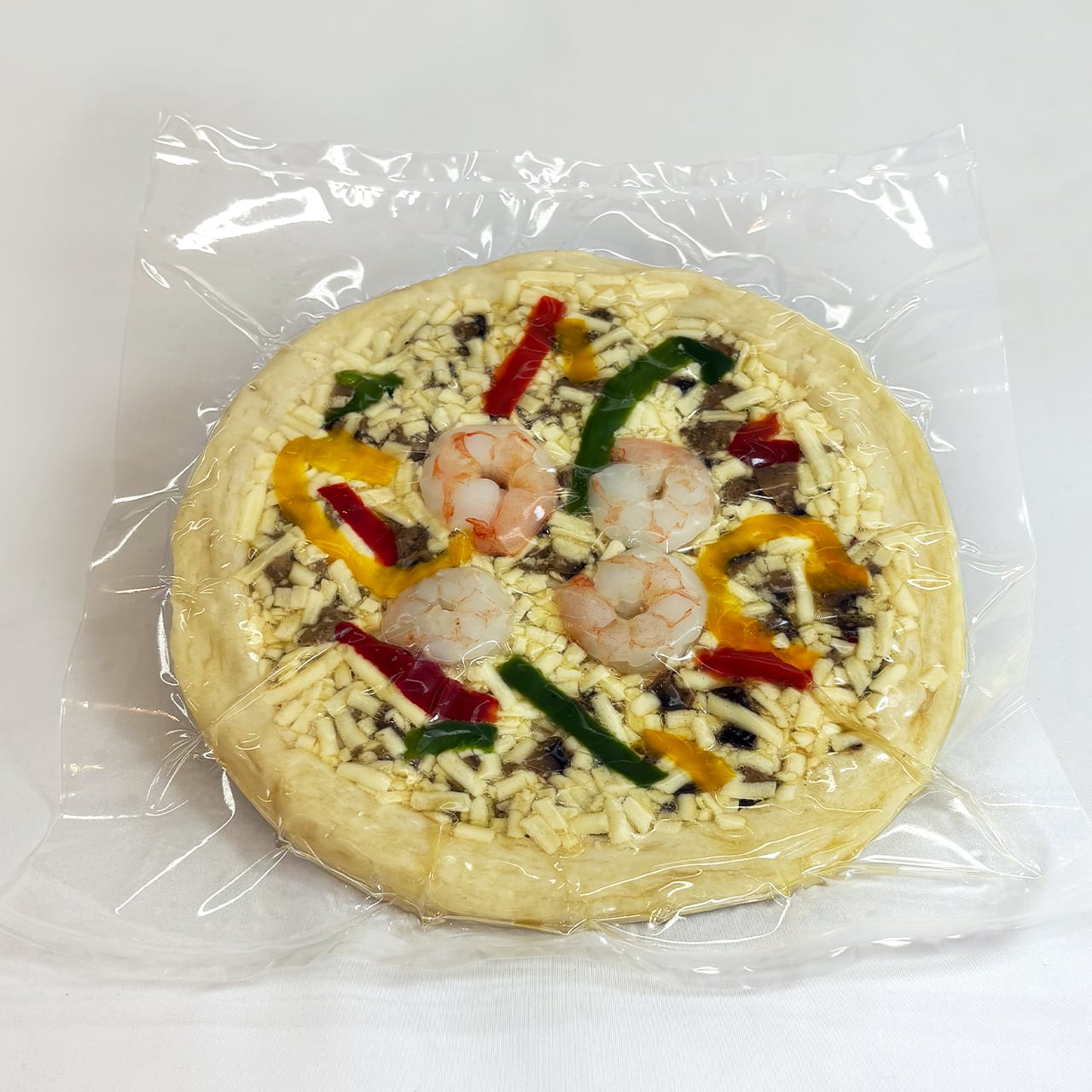 さぬきのこの生しいたけをふんだんに使用。オリーブオイルとガーリックに漬込み、上にたっぷりチーズとぷりぷりの海老、さらにパプリカをのせたピザ。トースターで温めるだけで美味しく召し上がれます。