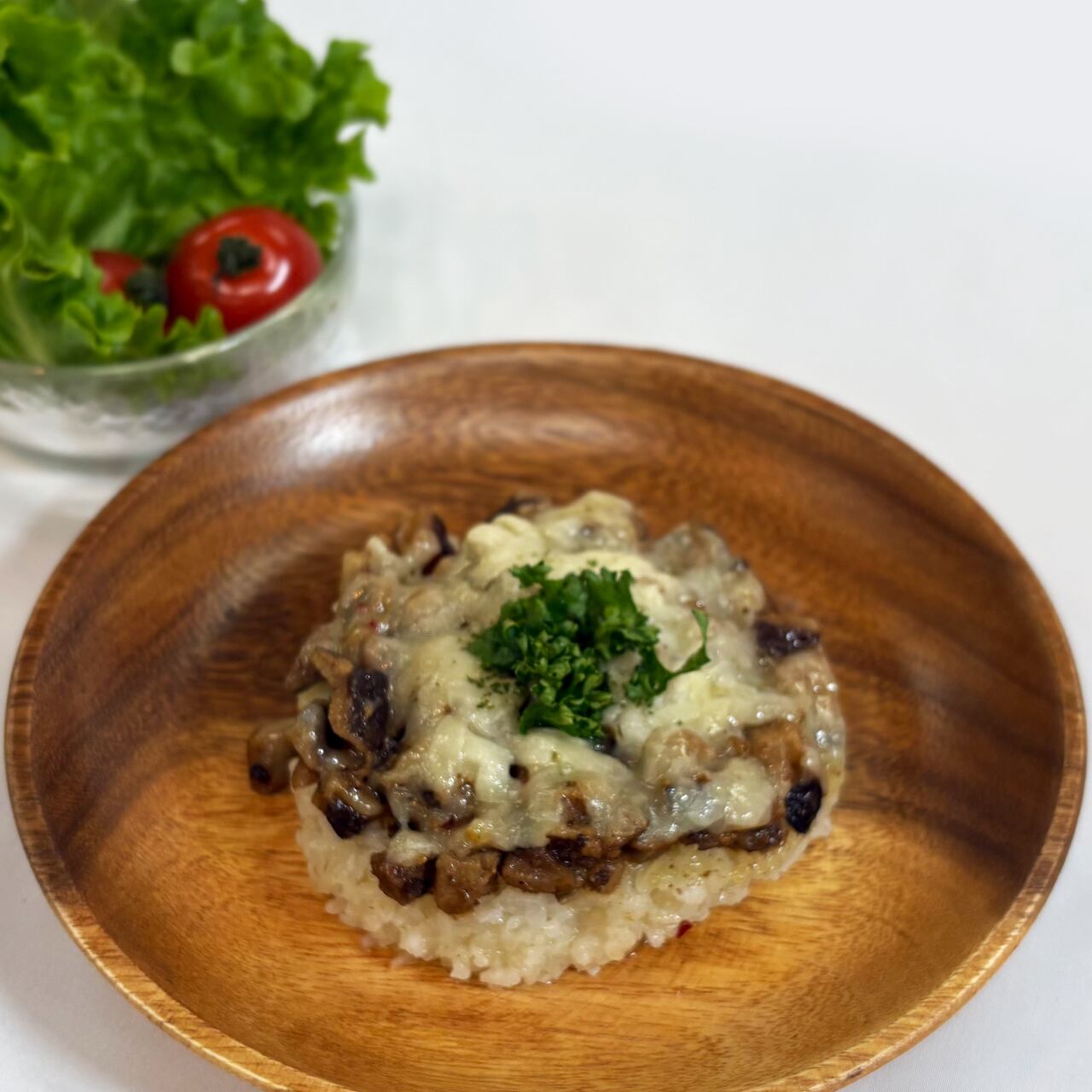 オリーブオイルとガーリックソースにさぬきのこの“肉厚しいたけ”を漬け込み、その上にふんだんにチーズをのせたドリア風ごはん。
